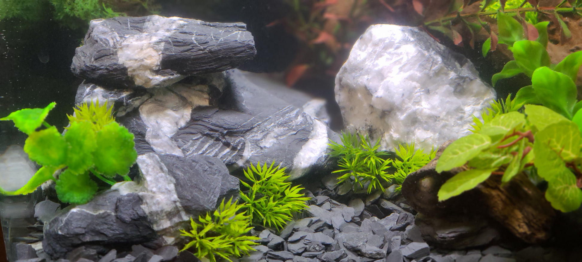 These beautiful stones have veins or chunks of white quartz running through the slate. Each box is a unique mix of stones from 1 to 3 inches. Some have more quartz than slate, some more slate than quartz. They have been sourced, washed, hand picked, and packaged by our family owned business here in the USA. They are safe to use in your scenery and will not deteriorate like resin. Perfect scale for Aquariums and Reptile enclosures. These stones pair beautifully with larger slate/quartz and our all grey slate as well as our aquarium gravel to give a more natural look to your tank or enclosure. Create caves, cliffs, berms and water falls in your aquarium, terrarium, paludarium or vivarium. Thoroughly rinse all stones before placing in your habitat. There are absolutely no coatings on this or any of our stone.